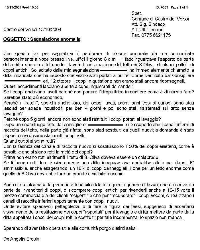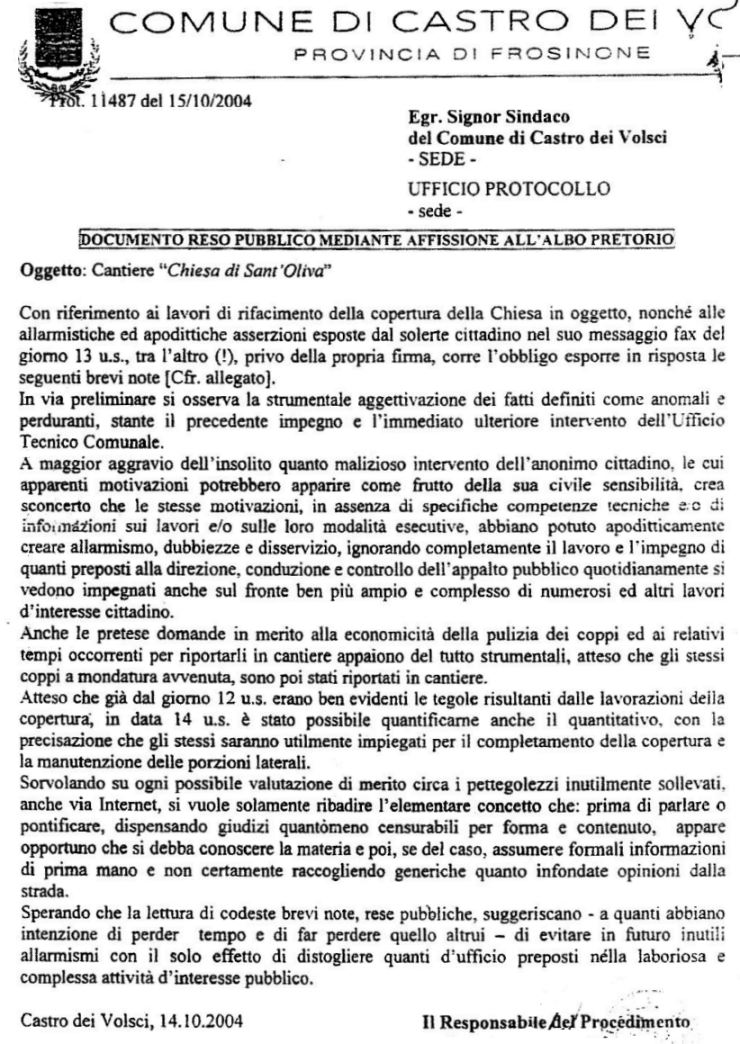 E' con dispiacere che ho letto la risposta ad un mio fax indirizzato all'ufficio tecnico comunale nel quale segnalavo alcune potenziali disfunzioni. Chiedo scusa pubblicamente se con il mio scritto (firmato in stampa essendo un documento digitale) ho turbato l'animo di alcuno, non era nelle mie intenzioni. Infatti il mio unico obbiettivo era collaborare nella salvaguardia del bene pubblico. Ma di fronte alla scelta di rendere pubblica la risposta in questione con affissione all'albo pretorio del comune, per logica conseguenza e per amor di chiarezza, mi trovo costretto a rendere pubblico anche il mio fax sul mio "albo pretorio" cioè questo sito. Per chiarezza di esposizione riporto in copia integrale entrambe i documenti in questione.